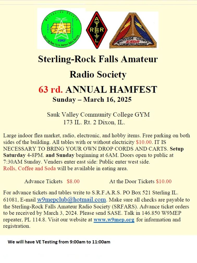 Sterling - Rock Falls Amateur Radio Society meets the last Thursday of every month except December. November's meeting is one week earlier if conflict with Thanksgiving. Meetings are held at the Coloma Township. 1200 Prophet Rd. Rock Falls, IL. Regular meetings are at 7:30pm. Dues are Regular - $12.00, and Senior citizens, students and second family members $6.00. S.R.F.A.R.S operates 146.850 repeater in Sterling, IL, 145.210, and 146.625 in Tampico, IL. CTCSS - 114.8. Repeater meetings are second Tuesday each month.